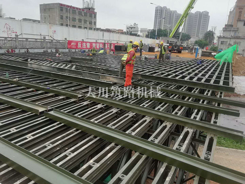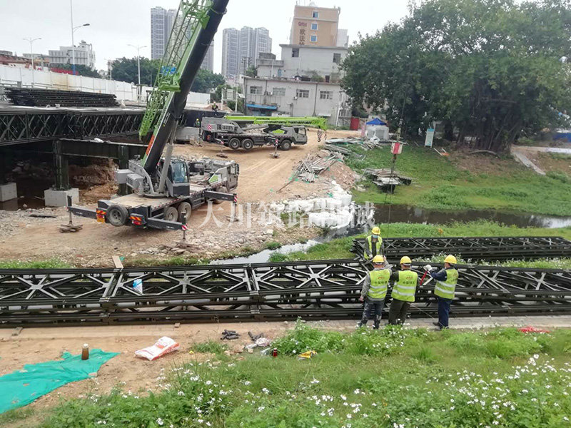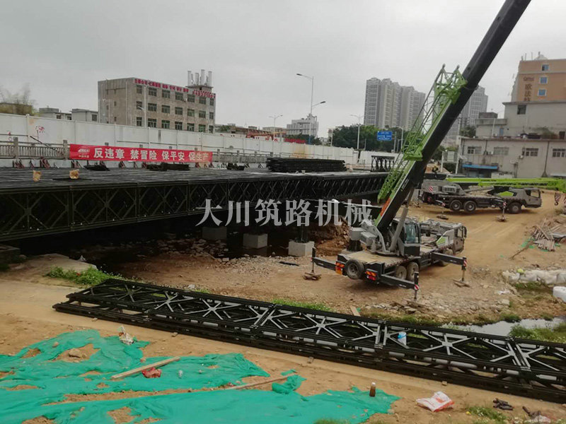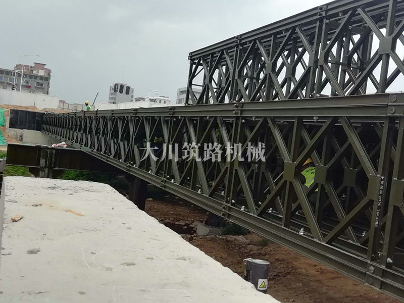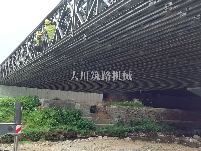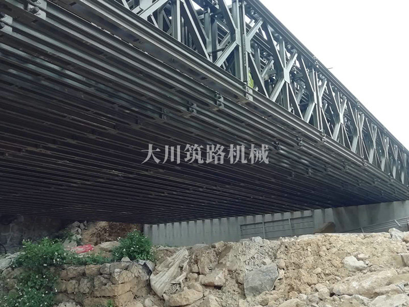 鋼橋型號:48m*16m加強型6(車道)+2(人行通道)+防撞護(hù)欄,上承式鋼橋,橫向布置35排貝雷梁,分兩跨,橋墩為單排四柱式φ800鋼管樁,上表鋪混泥土。